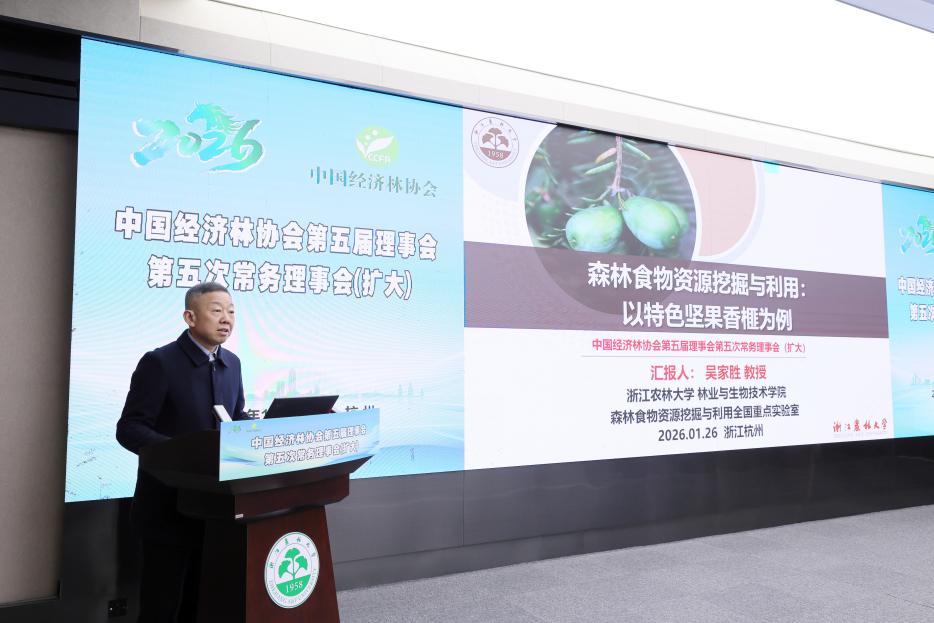我校校长、中国经济林协会第五届理事会副会长吴家胜致欢迎辞,并受邀作题为《森林食物资源挖掘与利用——以特色坚果香榧为例》的主旨报告。报告中,他系统介绍了学校香榧研究团队在基础理论探索、关键技术攻关和全产业链应用中的协同创新成果,生动展现了我校在森林食物资源领域的深厚学科积淀和鲜明科研担当。报告内容紧密结合产业发展实际,引发与会代表广泛共鸣,充分彰显了学校在该领域的学术引领地位,为深化校企协同合作、共促区域特色经济高质量发展奠定了坚实基础。