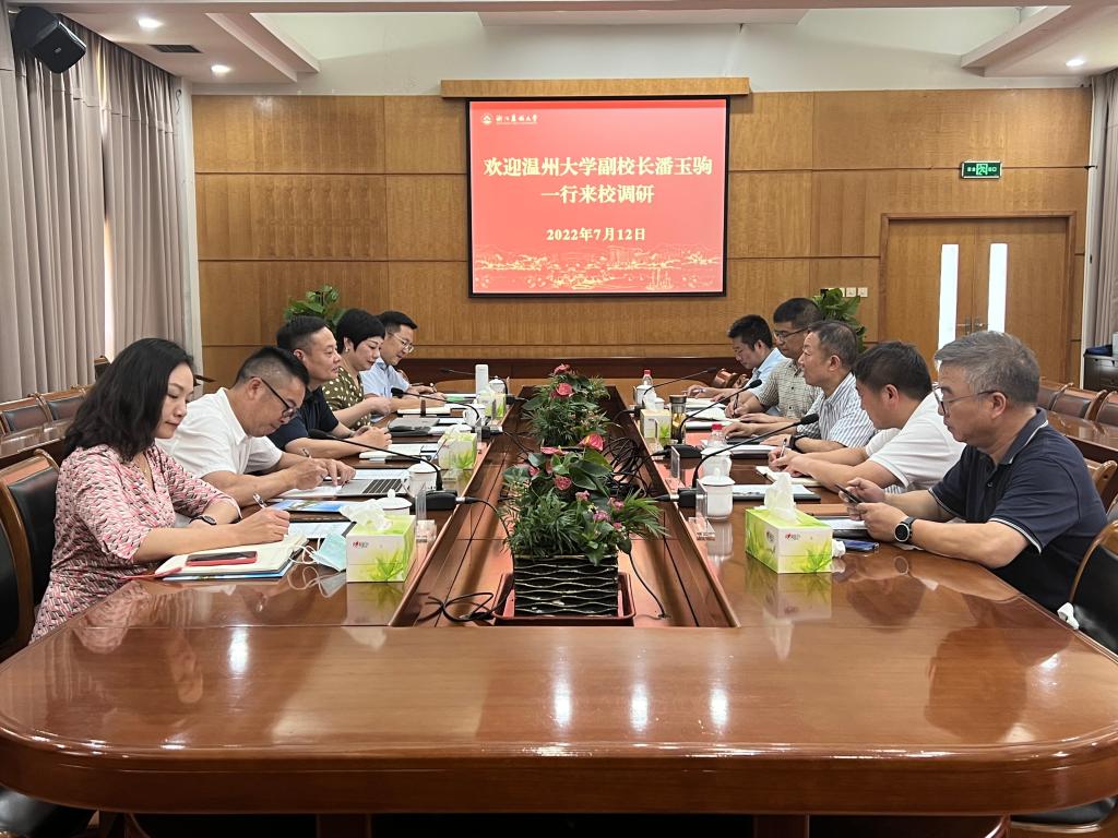 7月12日,温州大学党委委员、副校长潘玉驹一行来校考察交流校办产业经营管理等工作。我校党委委员、副校长吴家胜出席座谈会。