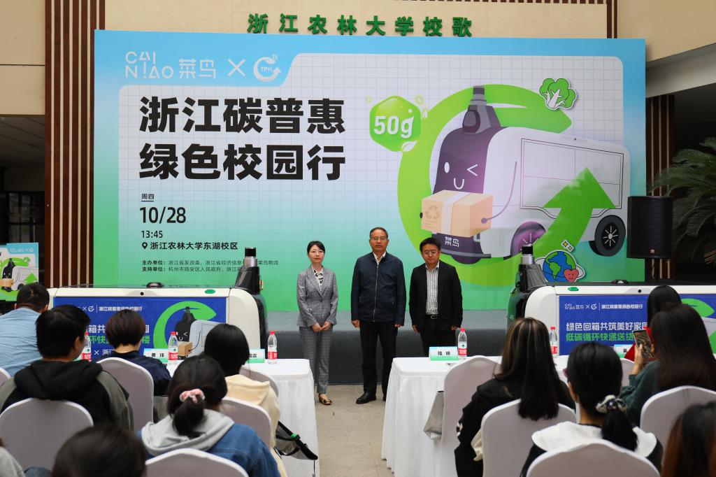 10月28日,由浙江省发改委、浙江省经济信息中心、菜鸟物流联合主办的“浙江碳普惠绿色校园行”活动在我校东湖校区活动中心举行。副校长胡祖吉,省发改委环资处处长陆琼、省经济信息中心能环部主任黄炜、浙能碳资产公司副总经理吴楠、菜鸟ESG副总裁牛智敬菜鸟绿色物流总经理王昊苏、等出席活动。