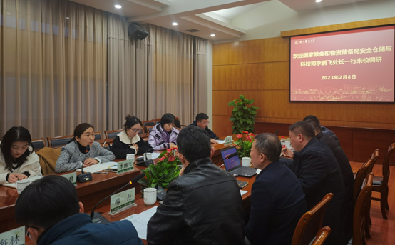 2月8日,国家粮食和物资储备局安全仓储与科技司李鹏飞处长一行来校调研指导工作。副校长吴家胜出席座谈会,科技处、合作处、农学院、食健学院、数计学院等单位负责人参加座谈。