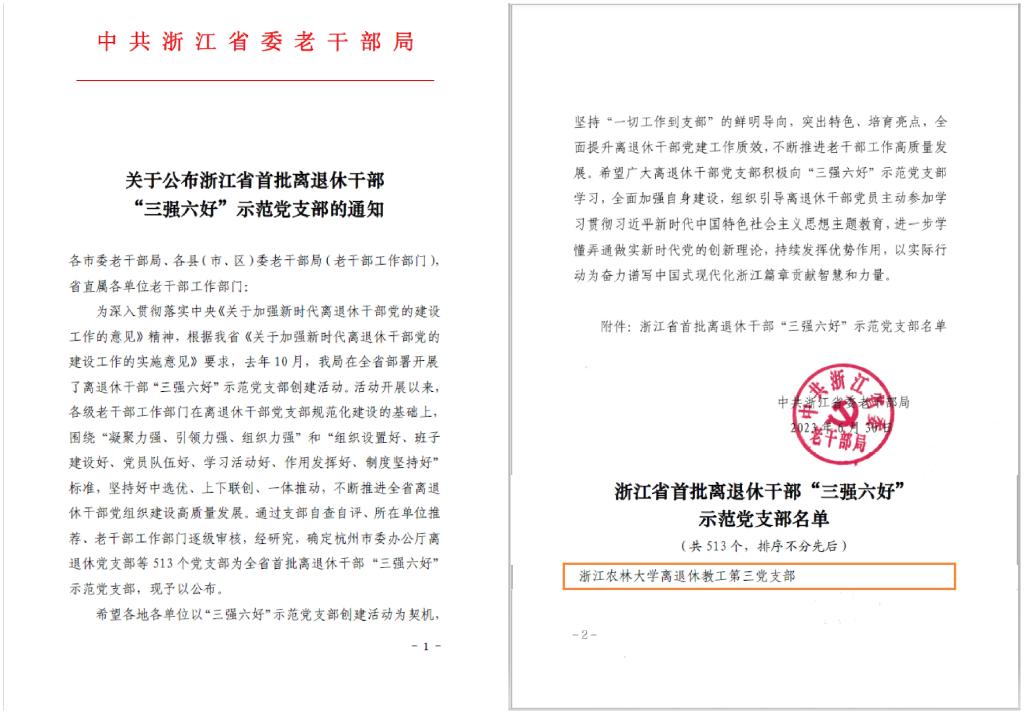 6月30日,省委老干部局公布了浙江省首批离退休干部“三强六好”示范党支部名单,我校离退休第三党支部成功入选。