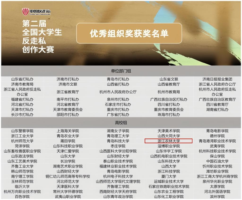 近日,第二届全国大学生反走私创作大赛获奖名单、首届“钱江杯”大学生反走私创作比赛获奖名单先后公布。在第二届全国大学生反走私创作大赛中,我校获高校组优秀组织奖,3件学生作品获优秀奖,郭冰老师获优秀指导教师奖。在首届“钱江杯”大学生反走私创作比赛中,我校获优秀组织奖,文法学院谭解等创作的《反走私风云》获得视频类作品三等奖,另有11件学生作品获优秀奖,郭冰、周雪峤2名老师获优秀指导教师奖。