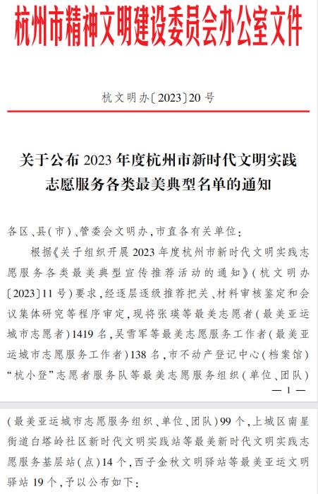 据悉,本次评选经逐层逐级推荐把关、材料审核鉴定和会议集体研究等程序审定,“服务总队”经由临安区委宣传部、区文明办推荐至杭州市文明办,全市共评选最美志愿服务组织(单位、团队)(最美亚运城市志愿服务组织、单位、团队)99 个,最美志愿者1419名。