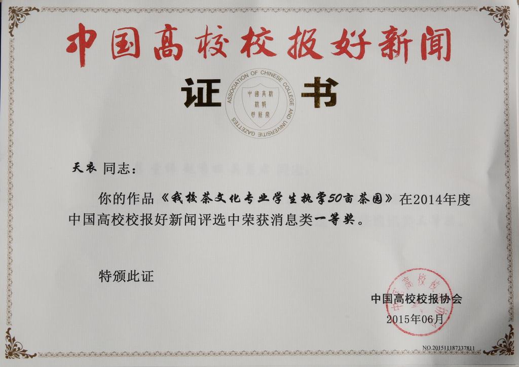 来自28个省市自治区的654所高校报送3032篇作品参评。经过中国高校校报好新闻评委会的评审,我校陈胜伟老师撰写的《我校茶文化专业学生执掌50亩茶园》获消息类一等奖;李广平老师,杨祈慧、董伟、赵秀丽、吴慧君同学撰写的《让教育一路春暖花开 访全国优秀教师雷家军教授》荣获通讯类三等奖;任重老师的《从“3.12”出发 大家一起来》获言论类三等奖;陈胜伟老师拍摄的《“世界水日”一瞥》荣获新闻摄影类三等奖;郑国眉老师编辑的《美女的隐藏部位是什么图片报》第526期第三版荣获版面类三等奖。