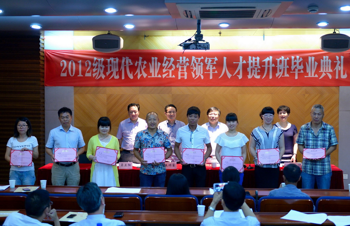 6月26日下午,2014届现代农业经营领军人才提升班毕业典礼在东湖校区举行。省农业教育培训中心主任朱顺富、副主任吴正阳,继续教育学院院长朱永法等出席毕业典礼。2014届现代农业经营领军人才提升班全体学员参加了典礼。毕业典礼由吴正阳主持。