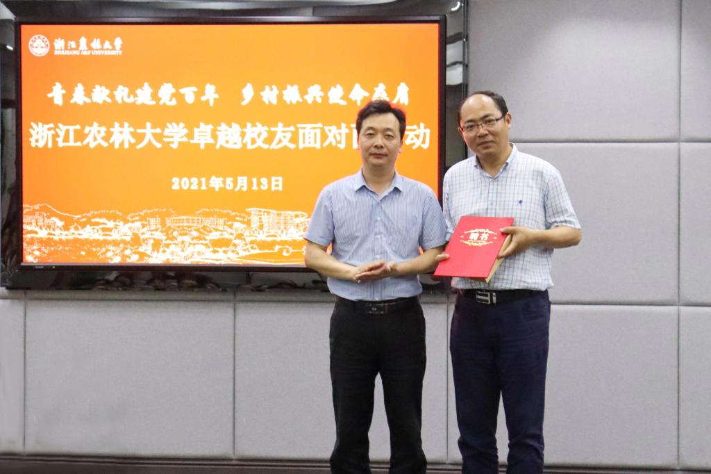 为庆祝中国共产党成立100周年,深入开展党史学习教育,5月13日,全国脱贫攻坚先进个人,我校经济林87级校友陈顶峰受邀来校参加卓越校友面对面活动。副校长胡祖吉会见陈顶峰一行。校党委委员、宣传部部长倪建均出席活动并为陈顶峰颁发了未来卓越校友成长营导师聘书。校友办、校团委相关负责人,各学院团委书记,校、院“未来卓越校友成长营”(“青马工程”培训班)学员150余人参加了活动。