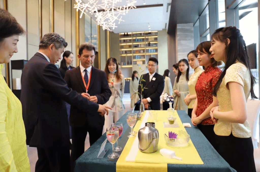 在会场上表演了《夜话南洋》茶文化舞台剧,传达了“茶和天下”的茶饮精神。师生们布置了三桌茶席,为大使们献上古今茶饮和茶酒调饮,赢得了中外嘉宾的高度赞誉。