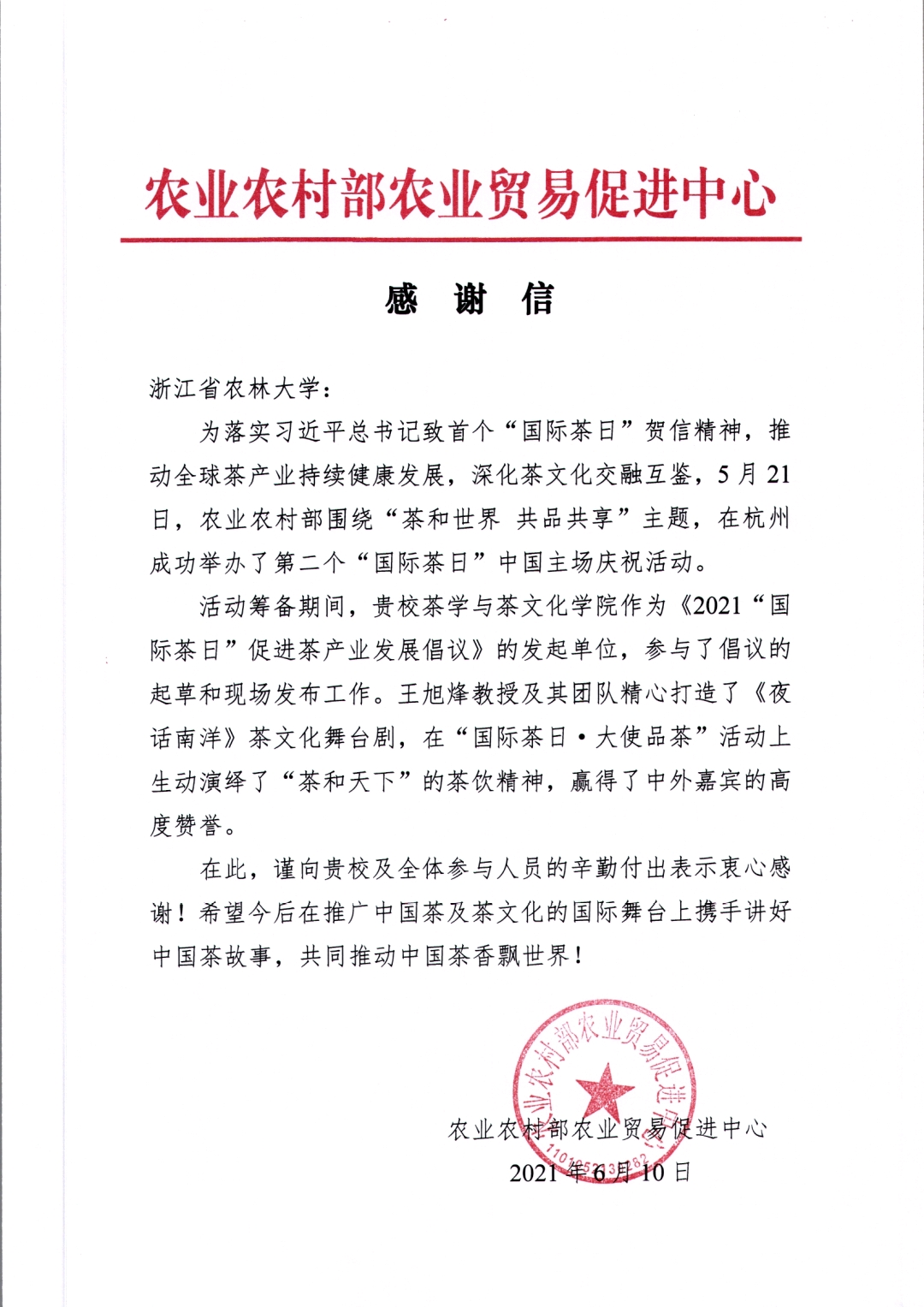 6月10日,农业农村部农业贸易促进中心向我校发来感谢信,对我校作为发起单位参与《2021“国际茶日”促进茶产业发展倡议》的起草和现场发布工作,在“国际茶日·大使品茶”活动上通过王旭烽教授及其团队精心打造的《夜话南洋》茶文化舞台剧生动演绎了“茶和天下”的茶饮精神的辛勤付出和突出贡献表示感谢。农业农村部农业贸易促进中心表示,希望今后在推广中国茶及茶文化的国际舞台上携手讲好中国茶故事,共同推动中国茶香飘世界。