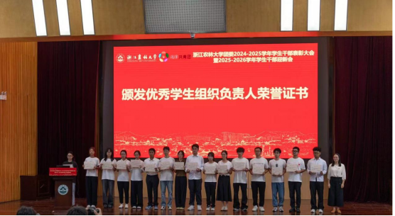 大会颁发了2024-2025学年学生干部聘书、团委学生兼职副书记聘书。大会表彰了2024-2025学年优秀学生组织负责人、优秀部门负责人、优秀工作者、礼仪之星等先进个人,校团委老师和学生组织负责人代表为他们颁发荣誉证书。