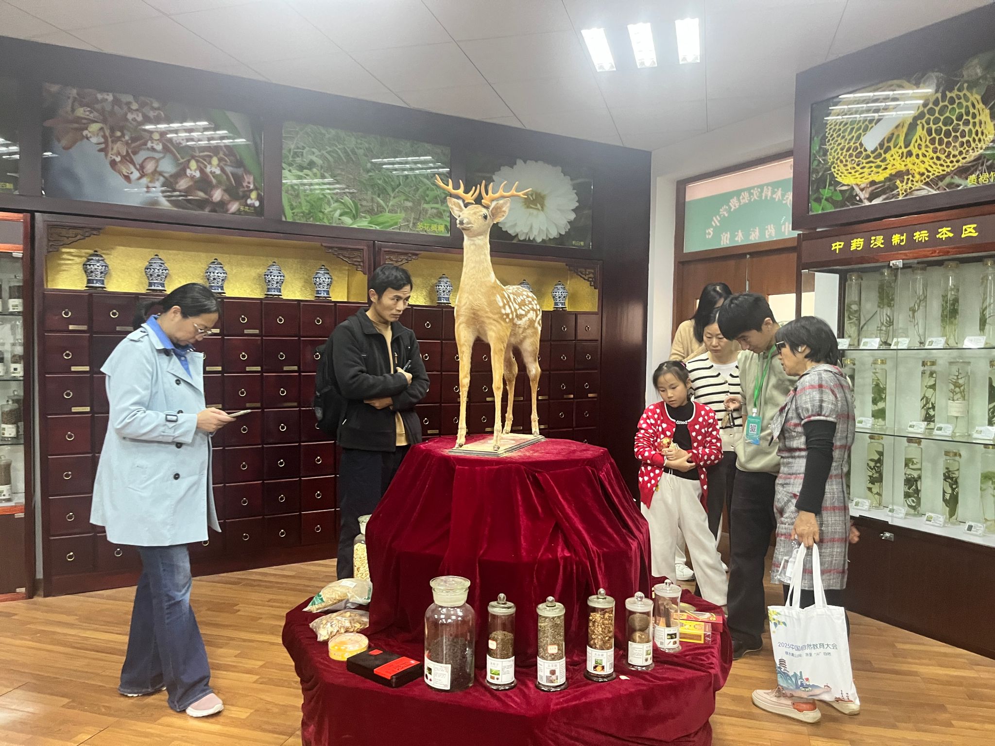 活动中,食健研233班与243班的学生讲解员带领大家走进学院中草药标本馆,生动讲述了标本馆的发展历程,系统介绍了浸制标本与蜡叶标本的制作保存方法、各类中药的分类与功效,以及蕴含传统智慧的中药仿真药柜。每一种药材背后,都承载着千年中医药文化的智慧,凝聚着自然的慷慨馈赠。