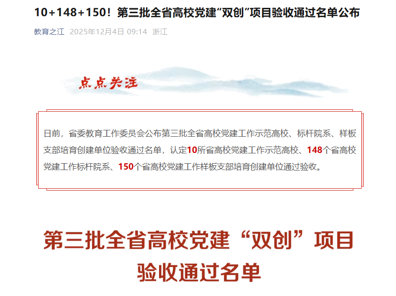 近日,省委教育工作委员会公布第三批全省高校党建工作示范高校、标杆院系、样板支部培育创建单位验收结果,我校风景园林与建筑学院党委、暨阳学院人文学院与马克思主义学院党总支、经济管理学院党委通过省高校党建工作标杆院系验收;风景园林与建筑学院风景园林学学科教工党支部、园艺科学学院园艺学科党支部、化学与材料工程学院化学学科党支部通过省高校党建工作样板支部验收。
