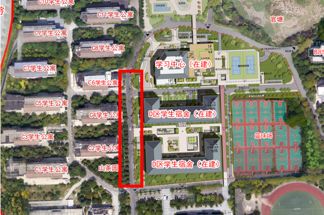 学生宿舍C6东面路口至山茶园东面路口,具体路段详见下图红框区域。
