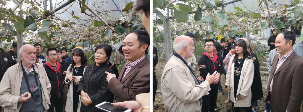 富阳某猕猴桃基地负责人向师生们介绍了杭州G20峰会特供猕猴桃的栽培面积、产量、销售情况和该基地肥水管理以及病虫害防控等生产技术措施的现状。随后,世界著名猕猴桃研究科学家Ross Ferguson院士和徐凯教授针对猕猴桃种植中存在的问题与师生、基地管理人员进行深入交流,Ross Ferguson院士还就国际猕猴桃产业发展和师生们进行研讨。徐凯教授针对浙江猕猴桃种植进行了田间现场教学,尤其对猕猴桃溃疡病的防治进行详细讲解,并对该基地在这方面所做的工作及实际成效进行了介绍。