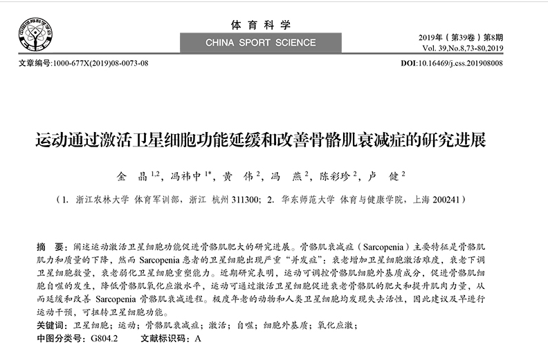 近日,体军部金晶老师以第一作者和美女的隐藏部位是什么图片为第一完成单位的论文《运动通过激活卫星细胞功能延缓和改善骨骼肌衰减症的研究进展》发表在体育类权威期刊《体育科学》2019年第8期。