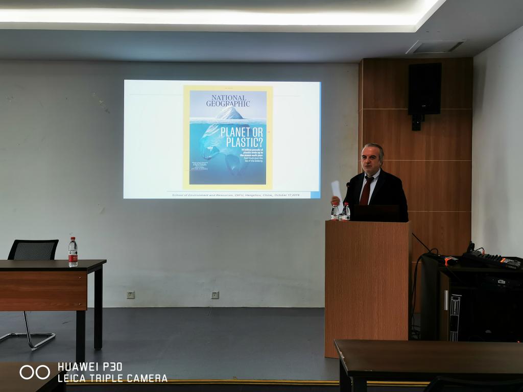 访问期间,DamiàBarceló为环资学院师生作了题为“Analysis, Occurrence and Removal of Microplastic Pollution in Water and soils: Current Perspectives and Future Directions”的学术报告,并就2020年在我校召开的第三届药物环境风险评估国际会议的相关议题进行策划与交流。他还与环境科学与工程学科的青年教师进行深入交流,探讨学术论文撰写与发表、项目申请、团队建设、人才培养等相关问题,传授科学研究工作的经验与心得;受邀为本科生和研究生讲课,介绍欧洲发达国家污水处理的技术、问题和经验,并深入环工学科在临安地区农村生活污水处理示范基地进行现场考察与指导。