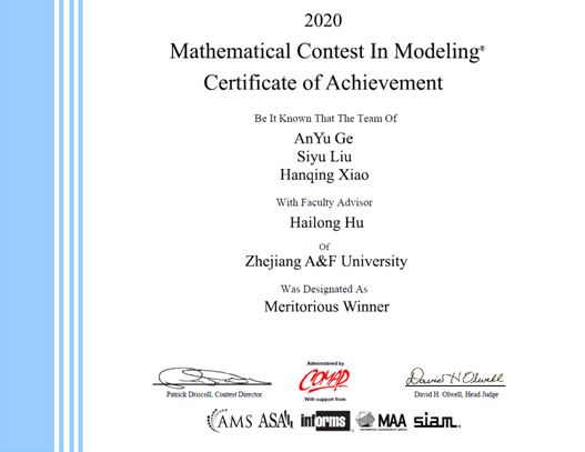 4月27日,从美国大学生数学建模竞赛(MCM/ICM)官网获悉,我校理学院信息与计算科学专业17级学生葛安宇、柳思雨、肖瀚庆组成的建模小组斩获Meritorious奖(一等奖)。