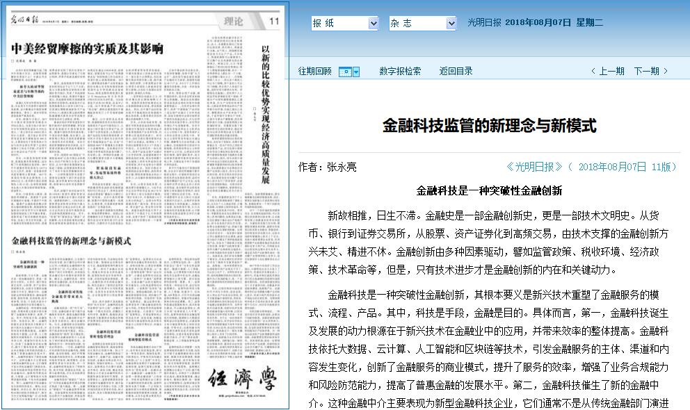 8月7日《光明日报》理论版刊发我校文法学院张永亮副教授的文章《金融科技监管的新理念与新模式》。