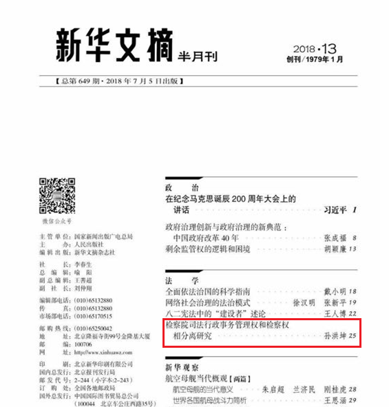 7月5日出版的2018年第13期《新华文摘》,全文转载了我校文法学院孙洪坤教授发表于2018年第2期《东方法学》(CSSCI)上的论文《检察院司法行政事务管理权和检察权相分离研究》。