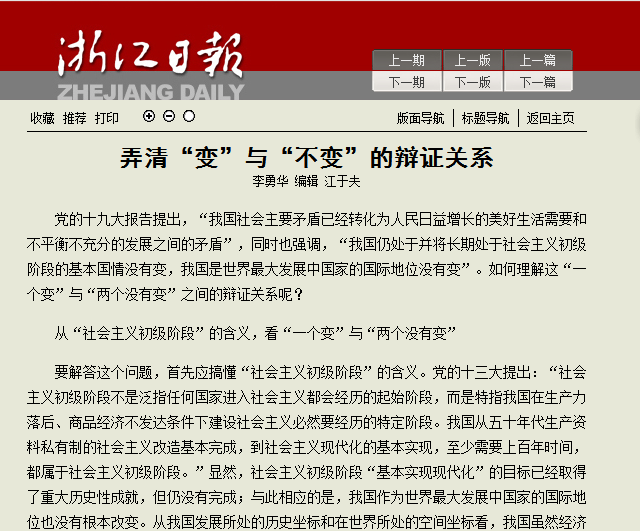 近日,《浙江日报》理论版以大篇幅刊登我校马克思主义学院党总支书记、浙江省中国特色社会主义理论体系研究中心学术委员会委员李勇华教授学习十九大理论文章《弄清“变”与“不变”的辩证关系》。