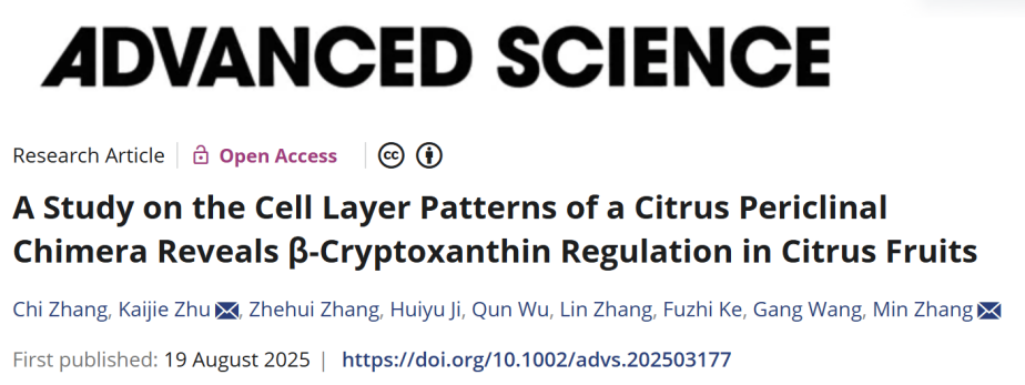 8月19日,园艺学院张迟副教授和华中农业大学园艺林学学院朱凯杰副教授以共同一作在《Advanced Science》(中科院1区,IF = 14.3)在线发表题为“A Study on the Cell Layer Patterns of a Citrus Periclinal Chimera Reveals β-Cryptoxanthin Regulation in Citrus Fruits”(《柑橘周缘嵌合体细胞层模式研究揭示果实β-隐黄质调控机制》)的研究论文。该研究在柑橘芽变调查中发掘出一个来自于温州蜜柑(OOO)和常山胡柚(CCC)的柑橘周缘嵌合体红肉胡柚(OCC),它具有果肉高效积累β-隐黄质的代谢特征。研究揭示了周缘嵌合体红肉胡柚果实各组织的细胞层来源及其两个供体所占比例,鉴定出一个转录因子MYB107并揭示其调控OCC及其供体之间β-隐黄质差异积累的分子机制,提出了柑橘β-隐黄质积累模式的新见解及其应用于水果品质提升的潜力。