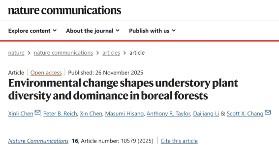 11月26日,全国重点实验室陈信力教授在《Nature Communications》(中科院1区Top,IF-5yr=17.2)发表题为“Environmental change shapes understory plant diversity and dominance in boreal forests”(《环境变化塑造北方森林林下植物多样性与优势格局》)的研究论文。该研究首次在大陆尺度揭示环境变化对北方森林林下植物多样性、生物量分配及层间互作的影响,为理解森林生态系统功能演变,以及森林食物、林下食物资源的潜在存续与利用提供依据。