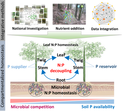 进一步研究证实,这一灵活机制是毛竹在竞争中胜出的关键。与周边绝大多数树种相比,毛竹叶片氮磷比的变异系数相对较低,生产力却能高出约25%。该研究不仅揭示了毛竹作为速生植物成功的生理生态学基础,其提出的“分区稳态”概念更创新性突破了传统生态化学计量学中稳态与可塑性对立的经典范式,为预测和调控森林生产力对全球变化的响应提供了新理论框架。