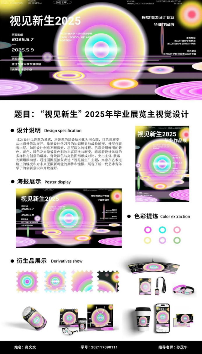 “视见新生”,寓意以全新的视角洞察世界,在传承与创新中孕育设计新生机。“视”,代表着视觉传达设计专业独特的观察与表达视角;“见”,是对社会现象、文化内涵的深度洞察;“新生”,既象征着毕业生们开启人生新篇章,也意味着设计作品打破固有思维,呈现出焕然一新的创意与理念。