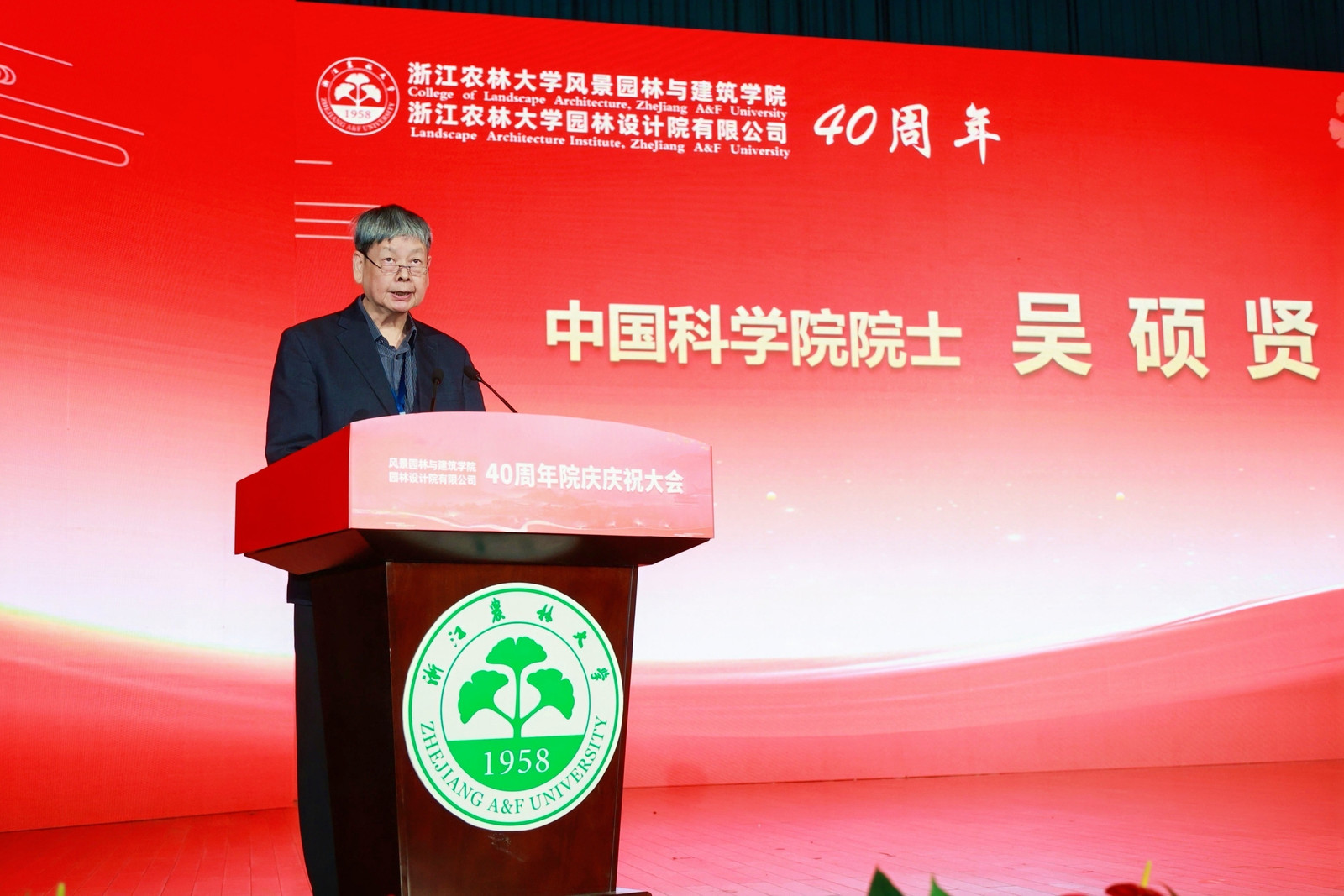 吴硕贤院士致贺词,肯定了园林学院四十年来在风景园林与建筑学科的创新实践、人才培养及对人居环境与城乡发展的贡献,建议学院进一步强化跨学科与产学研协同,培养全球视野人才,并在绿色低碳、乡村景观、文化遗产数字化、国际合作方向推进,为我国人居环境建设贡献智慧。