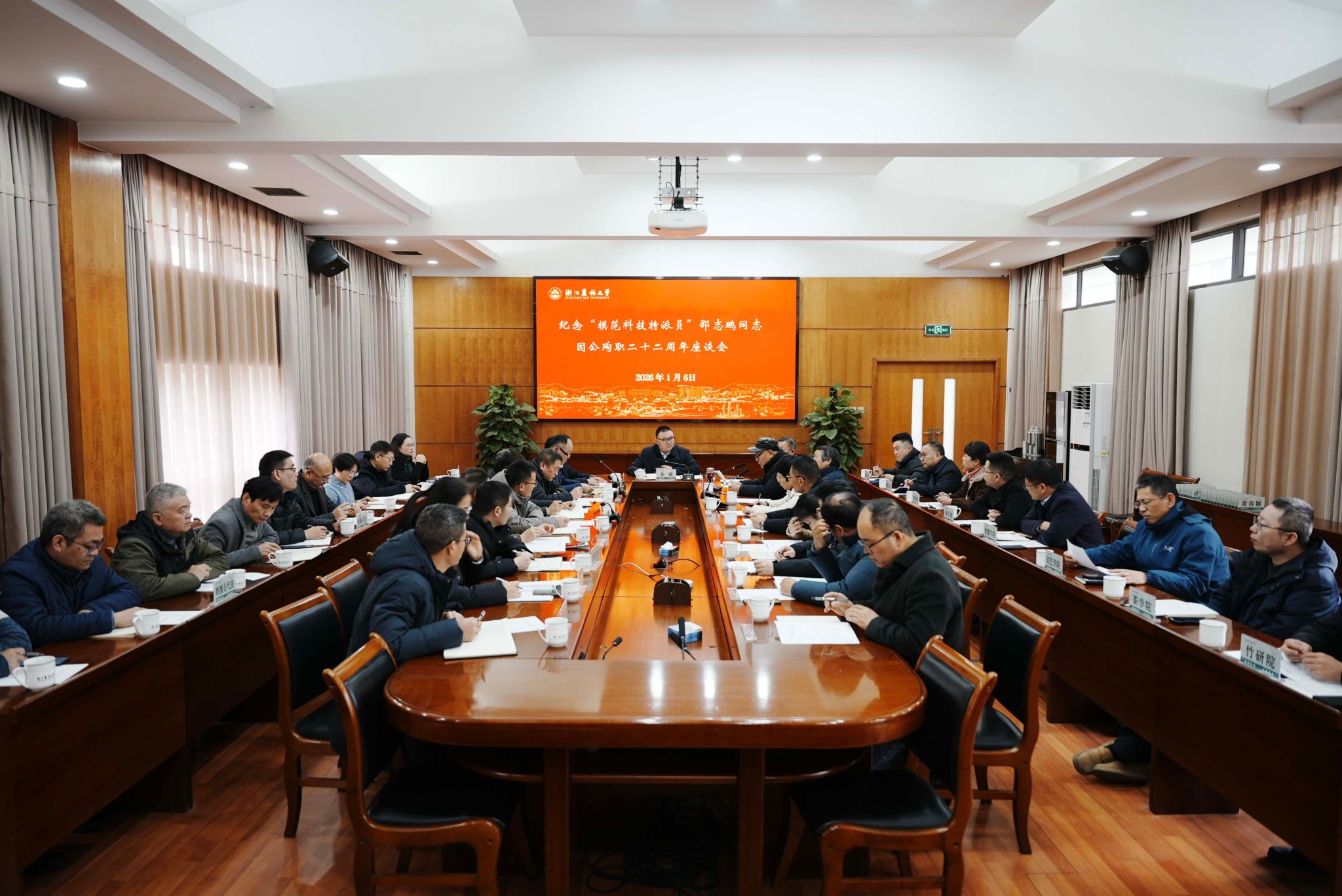 1月6日下午,学校组织召开纪念浙江省“模范科技特派员”邵志鹏同志因公殉职二十二周年座谈会,深入贯彻落实习近平总书记的重要指示批示精神,持续做深、做实、延拓好科技特派员制度。校党委书记朱斌出席座谈会并讲话。校长吴家胜出席会议。会议由副校长宋厚辉主持。