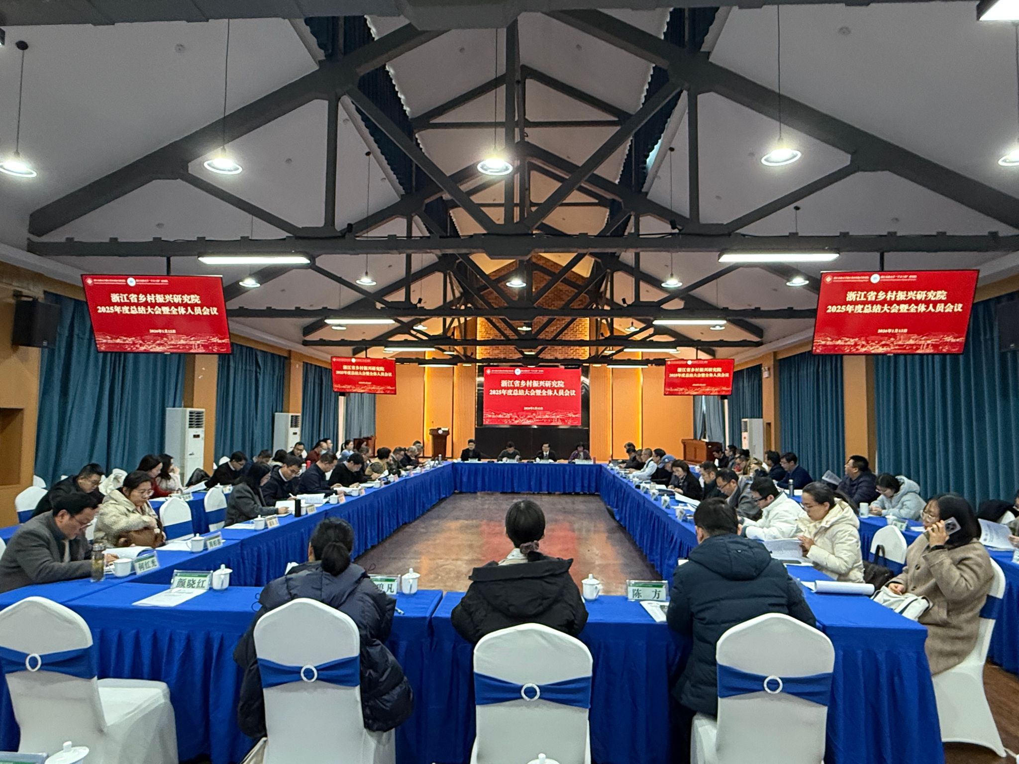 1月12日,浙江省乡村振兴研究院在印象农林大讲堂召开年度总结大会暨全体人员会议,总结2025年工作成效、研讨2026年工作计划。副校长杨圆华、宋厚辉,研究院院长沈月琴等参加会议。