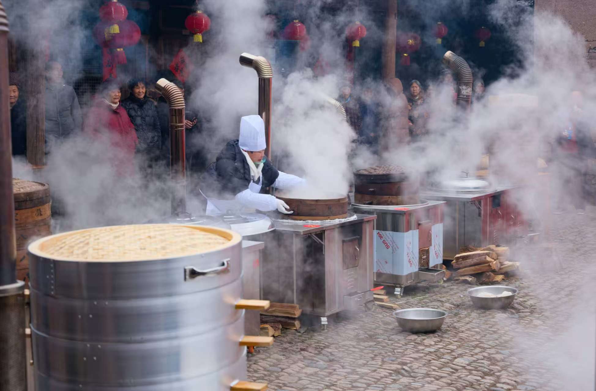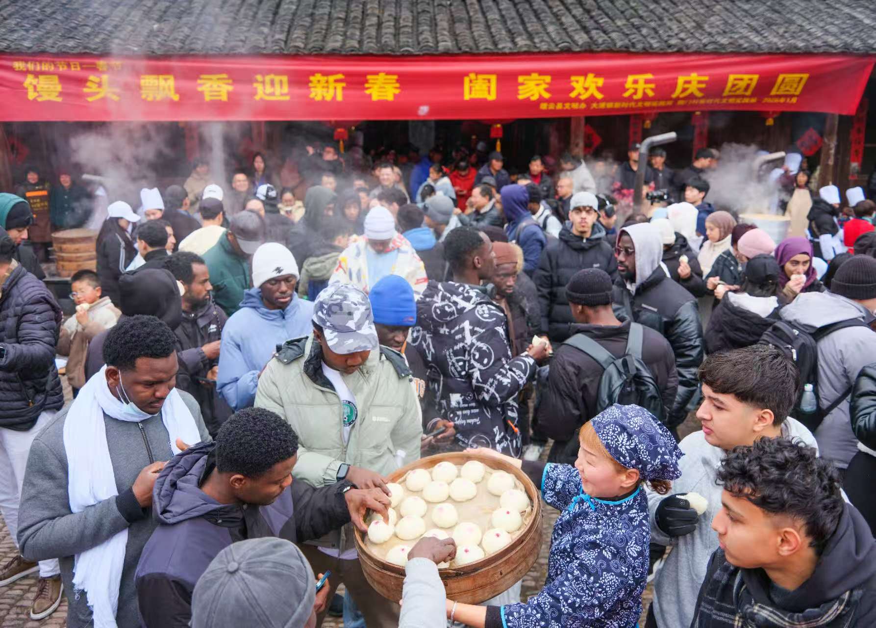 大源镇的年味,藏在千年传承的大源馒头里。作为缙云县非物质文化遗产,大源馒头承载着当地世代相传的民俗记忆,从腊月二十五的“馒头日”习俗到红军粮的红色过往,每一缕麦香都镌刻着岁月痕迹。活动现场,稠门村石子明堂暖意融融,留学生们带来的暖场节目率先点燃氛围,动感的旋律与现场揉面的簌簌声交织成独特的跨文化乐章。