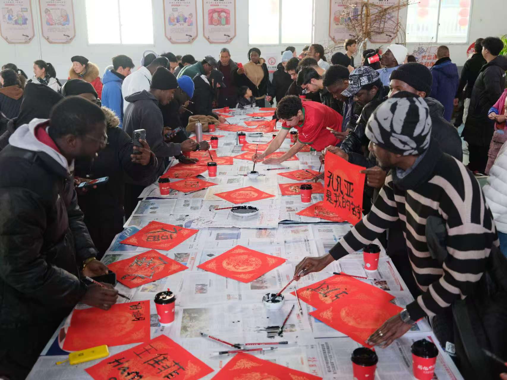 文化体验的旅程并未止步于美食。在大源村文化礼堂,褚建标、褚志平两位书法老师挥毫示范,留学生们手握毛笔,一笔一画临摹“斗福”与对联,墨香氤氲中体悟汉字的博大精深。
