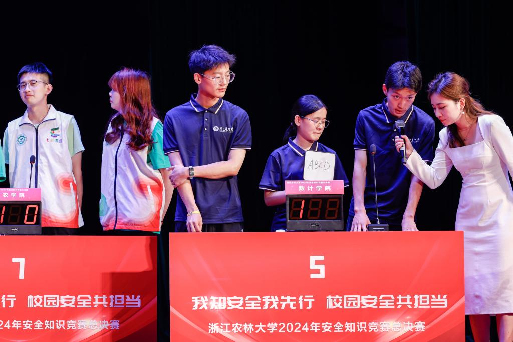 大赛围绕“我知安全我先行,校园安全共担当”主题,前期经过初赛和复赛,参与12028人次,参与率78%。通过层层选拔共有9支学院队伍脱颖而出晋级决赛。决赛共分为有问必答、你争我抢、风险对决和安全演讲四个环节。题目围绕国家安全、人身安全、心理健康、识诈反诈、交通安全、消防安全、实验室安全、毒品预防8个方面,现场答题氛围激烈,各支队伍充分展现了团队合作能力、现场反应能力和丰富的知识储备。安全演讲环节,各学院主题鲜明、情感真挚,通过一个个鲜活的案例向观众们传递了守护安全的重要性。