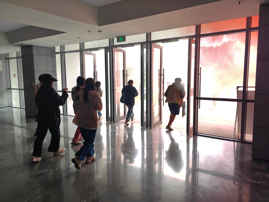 演练假设实验室因电气线路问题引发火灾,险情发生后,通知单位消防责任人,同时向校园消防部门报警。接警后,学院立即启动消防应急预案,组织国家重点实验室人员进行疏散。