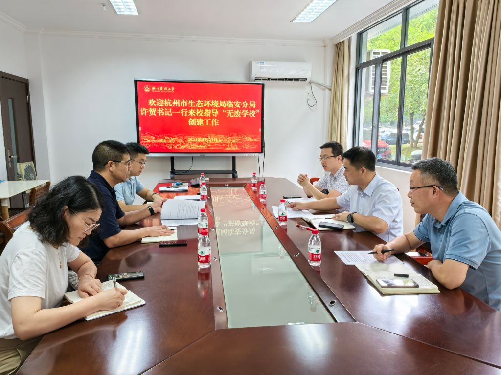 8月27日,杭州市生态环境局临安分局党组书记、局长许贺一行来校指导“无废学校”创建工作,公管处处长陈培金及相关负责人和工作人员参加座谈。