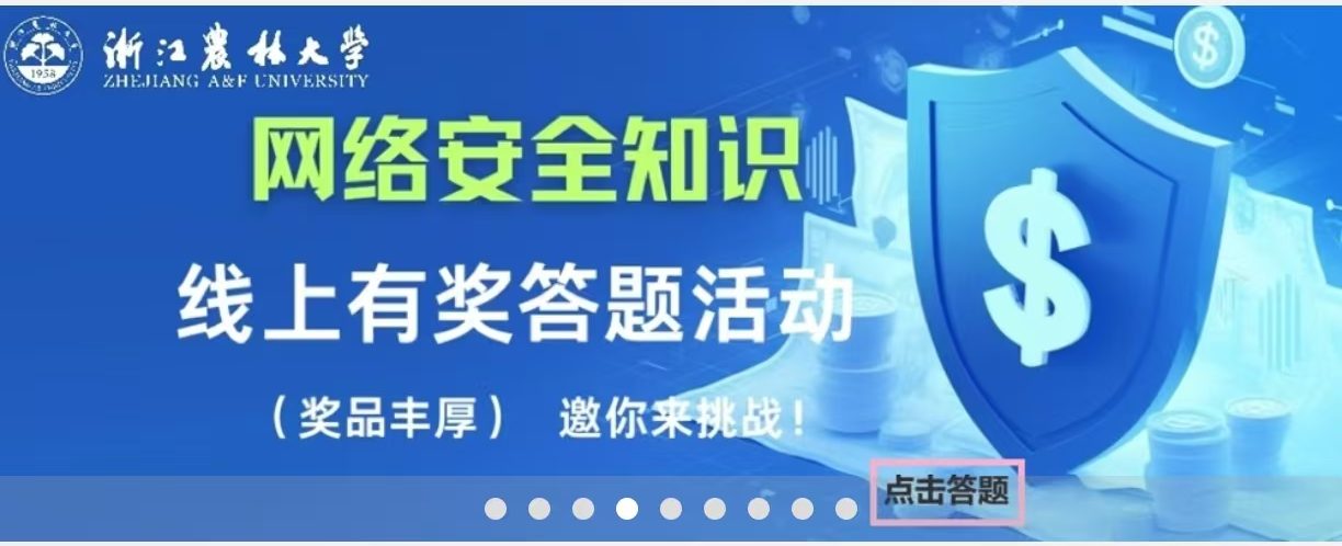 为扩大网络安全宣传的广度和深度,信息中心在智慧浙农林APP上推出了“网络安全知识线上有奖答题”活动。题目内容涵盖了网络安全的基本概念、常见风险、防范措施等多个方面,旨在通过轻松愉快的答题过程,帮助师生巩固和拓展网络安全知识。