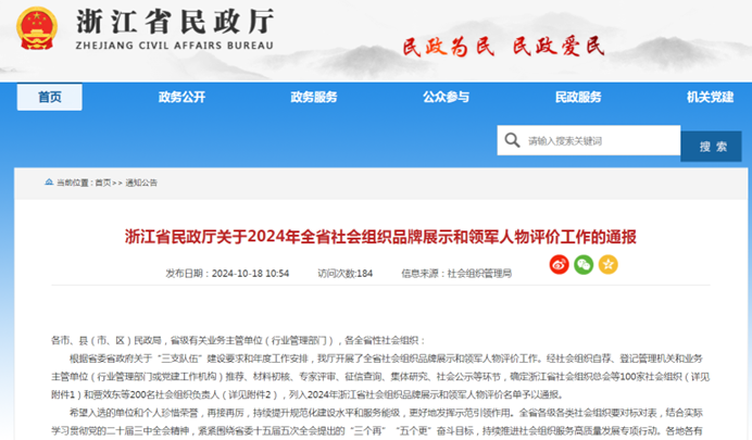 根据省委省政府关于“三支队伍”建设要求和年度工作安排,浙江省民政厅开展了全省社会组织品牌展示和领军人物评价工作。经社会组织自荐、登记管理机关和业务主管单位(行业管理部门或党建工作机构)推荐、材料初核、专家评审、征信查询、集体研究、社会公示等环节,最终确定100家社会组织和200名社会组织负责人,列入2024年浙江省社会组织品牌展示和领军人物评价名单予以通报。