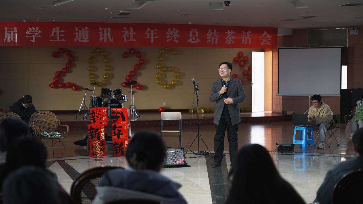 活动开场,通讯社指导老师陈胜伟充分肯定社员过去一年的付出,并寄语未来。社长张可随后回顾年度成果,温情分享赢得现场掌声。
