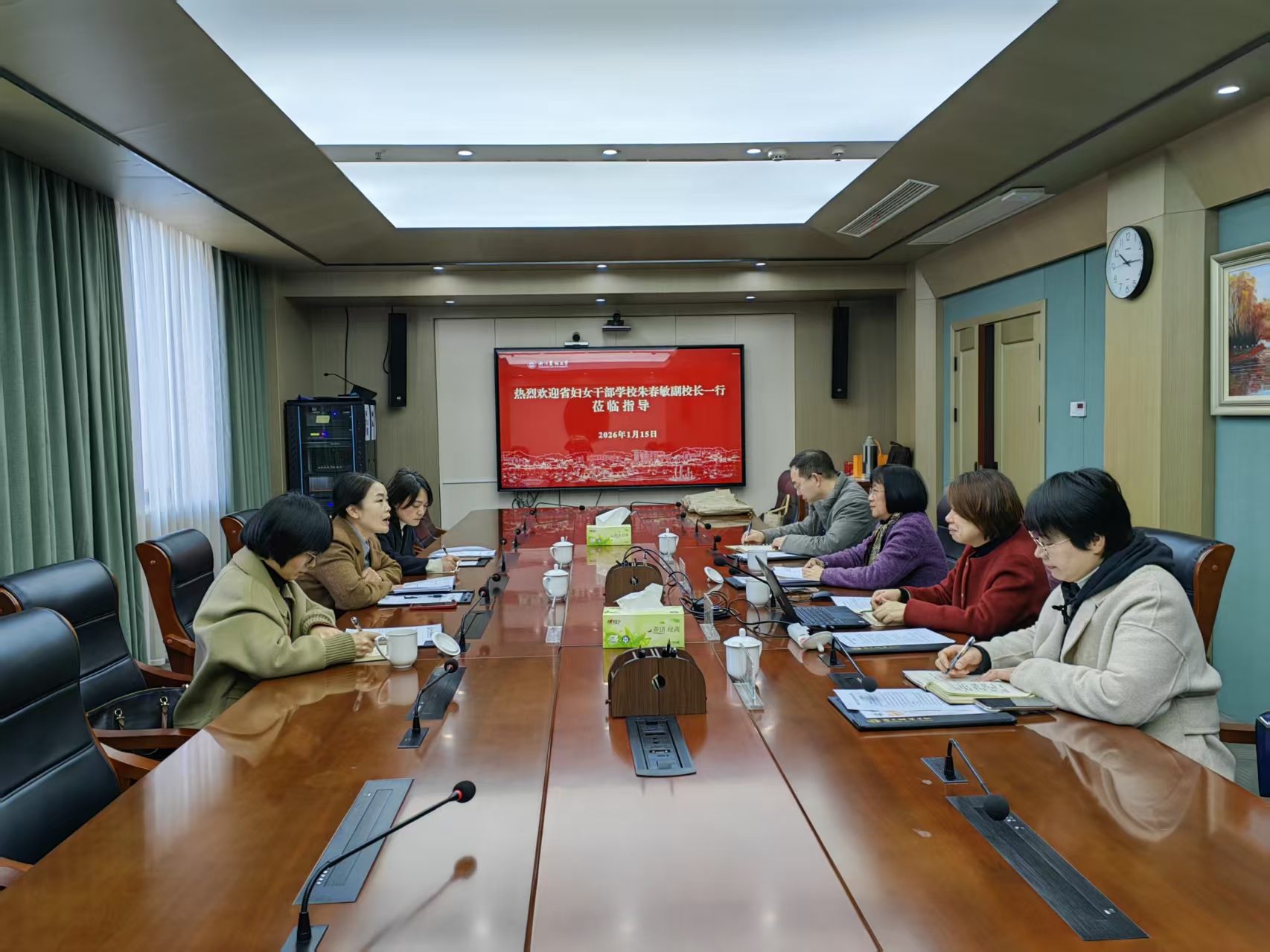 1月15日上午,浙江省妇女干部学校副校长朱春敏一行来我校调研,浙江省乡村振兴研究院院长、校妇联主席沈月琴热情接待并主持座谈交流。