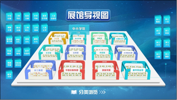 c.特设浙江出版集团、中国出版集团、长三角联合馆、联合推荐馆、学校装备馆、之江新华荐品馆及五大类馆区,并标志重点书目。