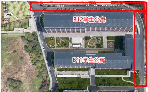 学生宿舍B12西面路口至学生宿舍B11东面路口,具体路段详见下图红框区域。
