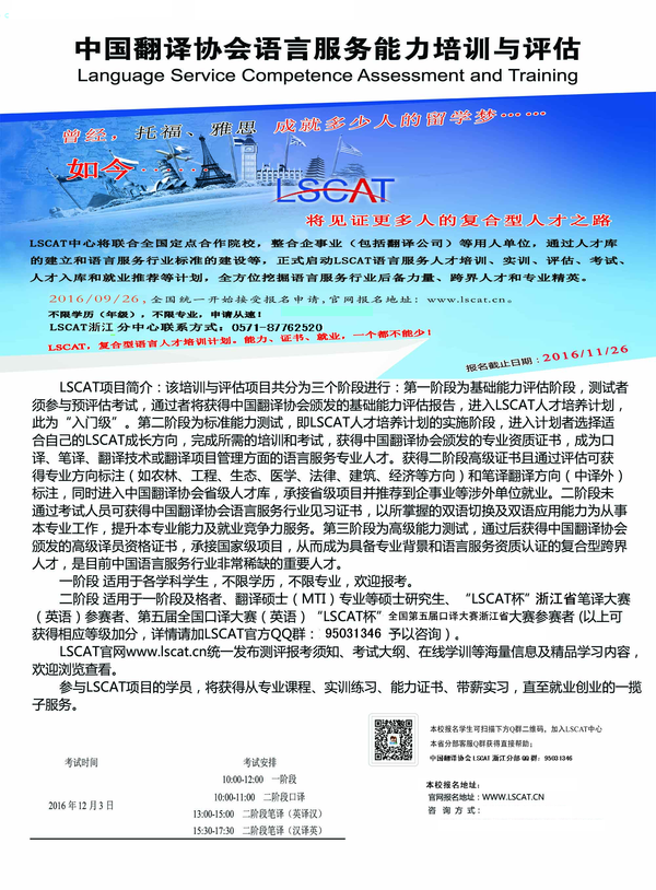 2016年下半年度中国翻译协会语言服务能力评估(LSCAT)将于2016年12月3日(周六)进行,申请参加评估的学生可以通过LSCAT官网(www.LSCAT.cn)完成注册报名缴费,有关详情以LSCAT官方网站公布的信息为准。
