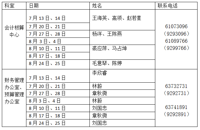 暑期项目申报、结题涉及财务审核与盖章,请在值班时间联系预算管理办公室、财务管理办公室值班人员办理。