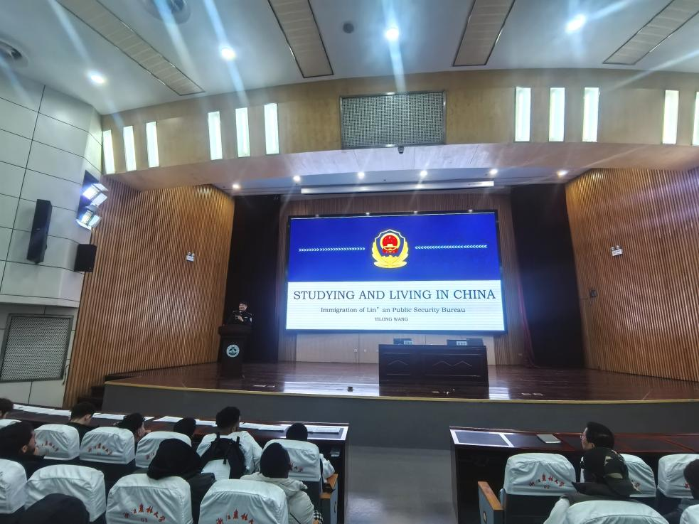 临安区分局警官王益龙为全体国际学生做案例警示讲座。他通报了杭州近期发生的违法犯罪典型案例,结合我校国际学生实际,从治安管理、出入境、禁毒、交通、宗教等方面为国际学生详细阐述了中国的具体法律条款,提醒国际学生在华留学期间必须遵守中国的法律法规,增强法律意识,绝不以身试法,做遵纪守法的国际学子典范。