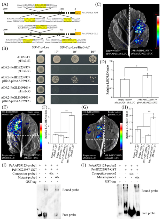 图2PeHDZ23987与PeAAP29123的启动子元件结合并激活其表达
