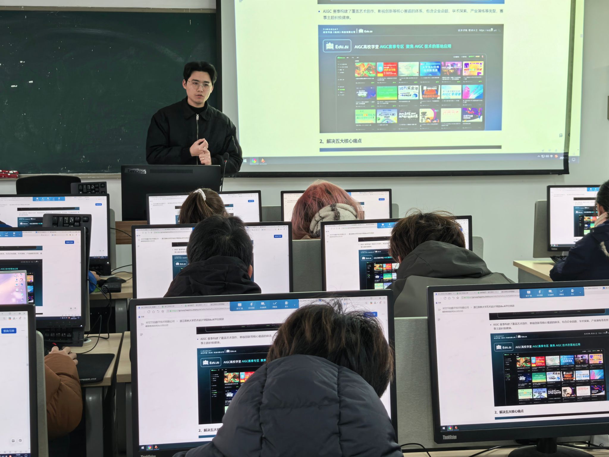 本次课程深度融入了“AI+”课程建设理念,依托校企合作实践平台,聚焦前沿技术应用。课堂上,张誉耀详细介绍了包括即梦AI、可灵、混元大模型在内的多款主流AIGC工具在工业设计场景下的具体使用方式与实践技巧,以及“Edu.AI”一站式智能创作与教学管理平台的功能效果。